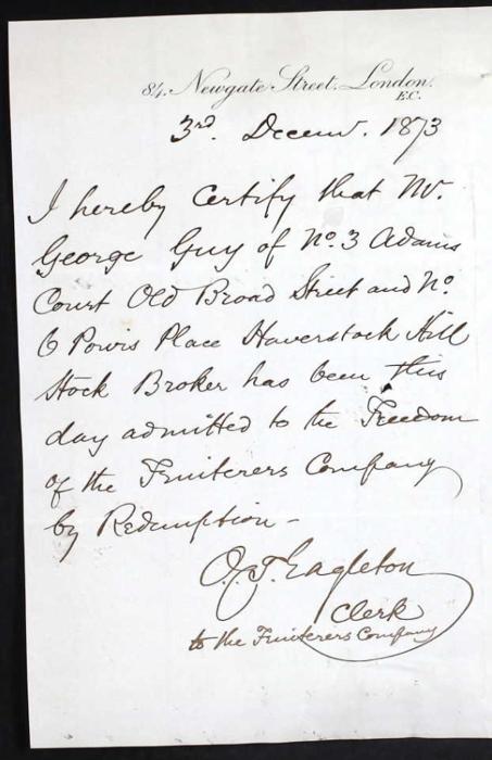Source: City of London Admission Papers 1873 - Letter from the Clerk, O C T Eagleton (1861-1890)